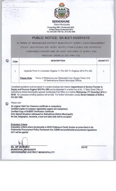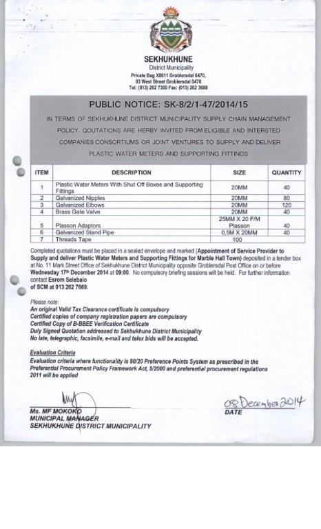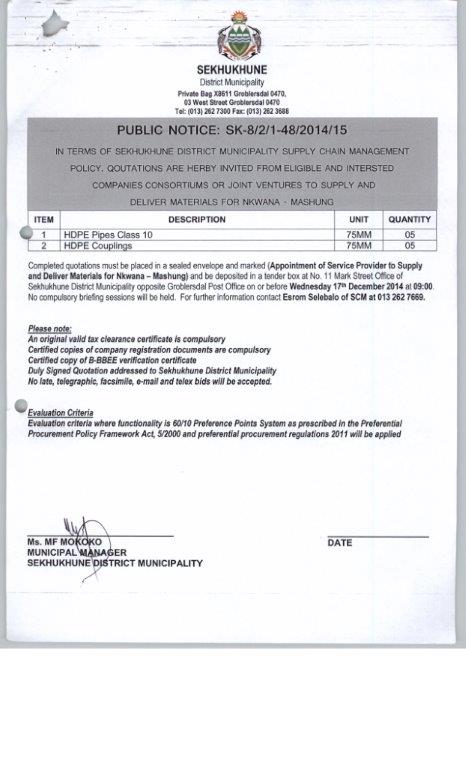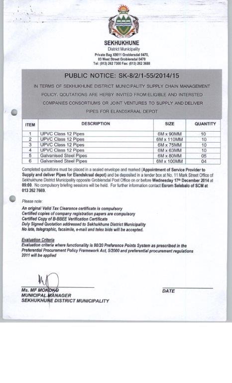 | Request for quotations-Supply And Delivery of 110m Diemeter Class 16 UPVC Pipes for Praktiseer Penge Depot O&M Team Within Fetakgomo Tubatse Region |  |
